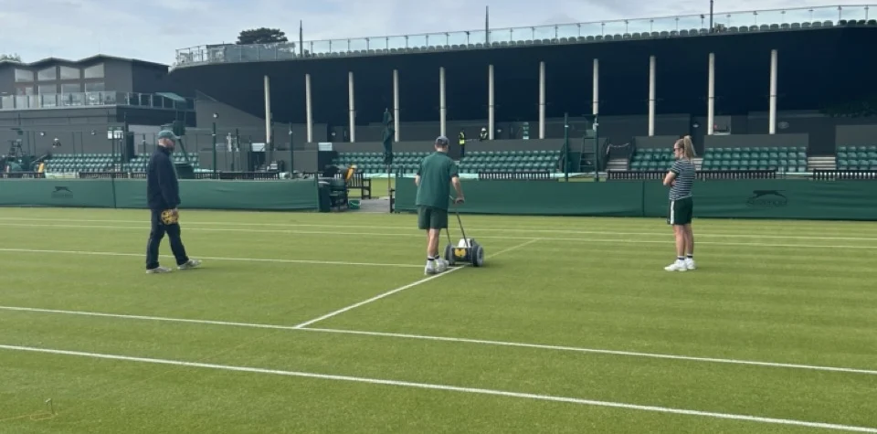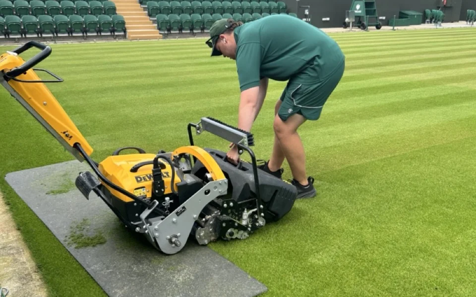 There is a strong sense of tradition in all aspects of the preparation, with the turf surfaces maintained to an astonishingly high calibre. All the courts to this day are still marked out manually using string lines. The grass surfaces are made up of a combination of four different strains of ryegrass. The strains are reviewed and changed every single year in collaboration with the team at the Sport Turf Research Institute (STRI) to ensure the courts can perform at the highest standards possible. All courts are hand-mown using DeWalt Cylinder Mowers at a cut height of 8mm for Championship play.