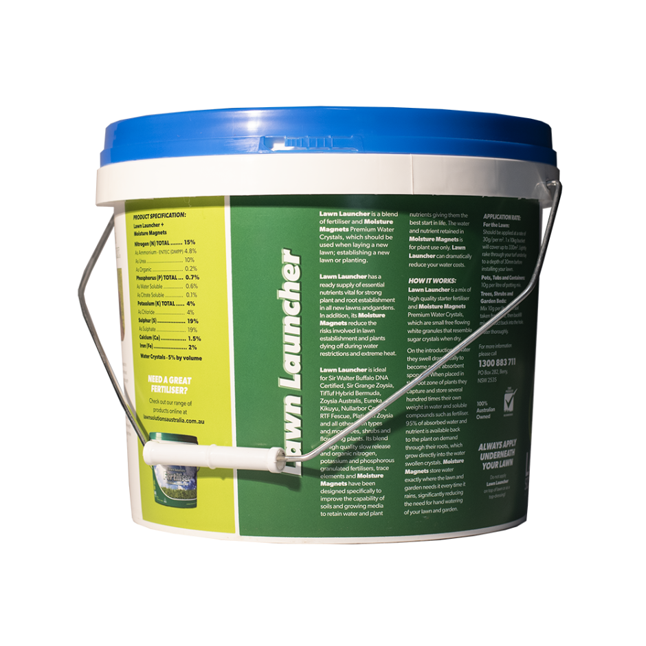 Lawn Launcher contains a high-quality fertiliser providing the nutrients your new lawn needs for the best start. Plus, moisture magnets reduce the risks involved in lawn establishment or plants dying off during water restrictions or extreme heat. Moisture magnets are free flowing white granules that resemble sugar crystals when dry. When wet, they will swell dramatically to become super absorbent. The collected water is then released to your lawn when it needs it.